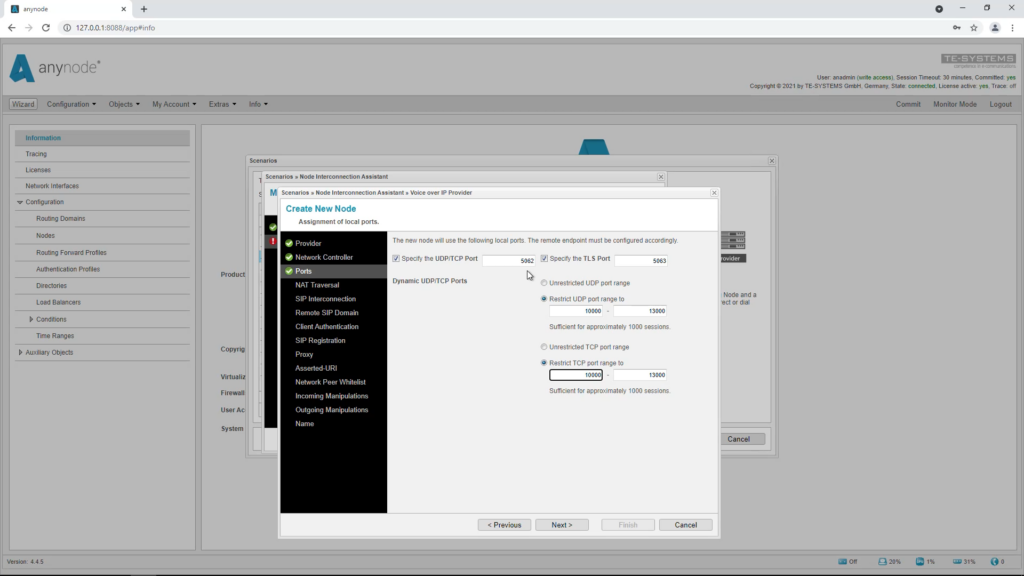The wizard has automatically entered the ports at this point. Teams is always set to TLS. The Teams node suggests port 5067 by default. This is the port on which anynode expects the incoming TLS connections from Teams. This port must be configured on the Teams side in the PSTN OnlineGateway.